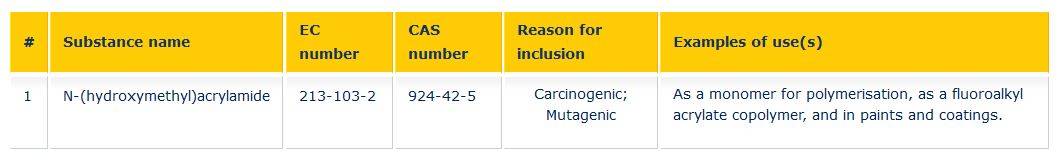 物品的进口商和生产商如其物品含有N-(羟甲基)丙烯酰胺,须于该物品被列入清单之日起计6个月内(2022年6月10日)通知欧洲化学品管理局。候选名单上物质的供应商,无论是单独供应还是混合供应,都必须向其客户提供安全数据表。